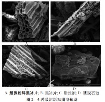 經(jīng)掃描電鏡觀察黑 冰片的結(jié)構(gòu)與活性炭相似,呈規(guī)則的網(wǎng)孔狀,蒙脫石 散呈不規(guī)則的塊狀結(jié)構(gòu),見圖 2。