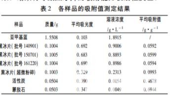 各樣品吸附值結(jié)果見表 2。 結(jié)果顯示,黑冰片對亞甲基藍(lán)有一定的吸附作用,不 同生產(chǎn)批次的同等質(zhì)量的黑冰片吸附能力差異不 大,說明生產(chǎn)廠家生產(chǎn)的黑冰片質(zhì)量穩(wěn)定。比較不 同粒徑黑冰片吸附能力可知,黑冰片顆粒粒徑越小, 吸附能力越強(qiáng)。比較相同質(zhì)量的各種吸附劑的吸附 能力,黑冰片的吸附能力最弱,蒙脫石吸附能力最 強(qiáng)。由此可以得出黑冰片作為炭類藥物具有一定吸 附能力,但是其吸附能力與活性炭、蒙脫石這類臨床 常見藥相比不是很強(qiáng)。