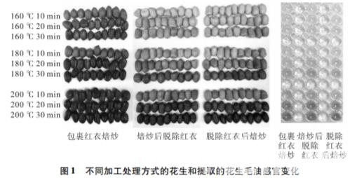 不同加工處理方式的花生及提取的花生毛油 的感官變化( 見(jiàn)圖 1)
