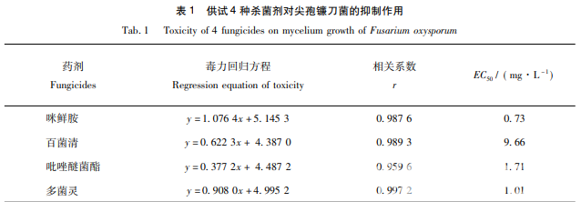 使用 EXCEL2016,DPS7. 05 數(shù)據(jù)處理軟件對所得的數(shù)據(jù)進(jìn)行統(tǒng)計(jì)分析,得出各藥劑的 毒力回歸方程、EC50和相關(guān)系數(shù)。