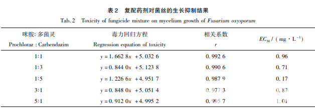 選取 2 種藥效作用較好的藥劑進(jìn)行復(fù)配,以 EC50濃度按照不同比例配比,配比為 1∶ 1, 1∶ 3,1∶ 5,3∶ 1,5∶ 1。再在不同比例配比下設(shè)置 5 個濃度梯度,濃度稀釋按照逐級稀釋法稀釋濃度,實(shí)驗(yàn)按 照 1. 2. 2 和 1. 2. 3 中所述方法進(jìn)行。