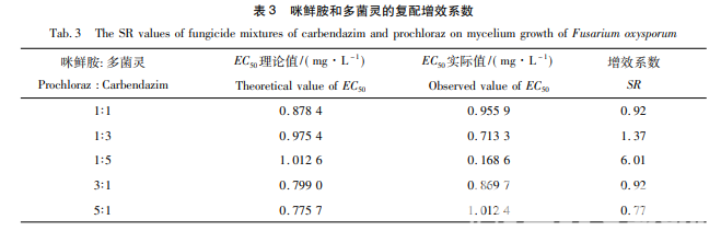 復(fù)配殺菌劑對橡膠樹枯萎病病原菌的抑制效果見 表 2,由表 2 可見,咪鮮胺和多菌靈 1∶ 1,1∶ 3,1∶ 5,3∶ 1 及 5∶ 1 復(fù)配條件下 EC50值分別為 0. 96,0. 71,0. 17, 0. 87,1. 01 mg·L - 1 ,1∶ 5 的復(fù)配效果最佳,5∶ 1 的復(fù)配效果最差。咪鮮胺和多菌靈的復(fù)配增效系數(shù)見表 3,由表 3 可見,咪鮮胺和多菌靈 1∶ 1,1∶ 3,3∶ 1 及 5: 1 復(fù)配條件 下增效系數(shù)分別為 0. 92,1. 37,0. 92,0. 77,均在 0. 5 ~ 1. 5 之間,2 者藥效作用為相加作用,無拮抗作用。 咪鮮胺和多菌靈配比在 1∶ 5 時,SR 值為 6. 01,表現(xiàn)為增效作用。