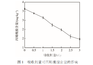 輻照消解油炸土豆片中丙烯酰胺是利用 60Co 衰 變產(chǎn)生的 γ 射線處理淀粉類熱加工食品,通過輻照過 程中基質水分產(chǎn)生的自由基誘導丙烯酰胺發(fā)生聚合 反應生成無毒的聚合物,從而達到消除基質中已生成 丙烯酰胺的目的。吸收劑量和基質含水量對丙烯酰胺 的輻照消解效應影響較為顯著,Na2CO3、異抗壞血酸 鈉、芝麻酚可促進丙烯酰胺的輻照消解,添加芝麻酚 后丙烯酰胺的消解率最高為 60.49%。此研究從增加 丙烯酰胺分子量的角度考慮,使用較為成熟的輻照技 術聚合消除已生成的丙烯酰胺,不僅對食品風味無影 響且成本較低,是對淀粉類熱加工食品中丙烯酰胺控 制方法體系的補充,可為淀粉類農(nóng)產(chǎn)品熱加工后控制 丙烯酰胺的含量提供理論基礎。