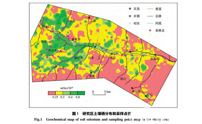 研究區耕地主要分布在湟水河及各支溝谷地兩 側。在研究區耕地中選擇典型富硒( Se≥0.4×10-6 ) 區和低硒區布設表層土壤樣品共 50 件,具體采樣點 位見圖 1。為保證樣品代表性,采取多點組合采樣 的方法,即在設計樣點位置選擇 1 個主點,并在同一 地塊中以“梅花法”選擇 3 ~ 4 個副點采集表層 0 ~ 20 cm 耕作層土樣,具體方法為用鐵鍬先挖采樣坑,然 后用竹片去除與金屬采樣器接觸的土壤,再采集所 需樣。每件樣品采集后須清除干凈工具上的泥土,將采集的樣品掰碎去除根系、石塊等雜物后將主副 點樣品混合,用四分法留取 1 ~ 1.5 kg 裝入布袋中, 同時記錄采樣點所處的土壤類型、成土母質、土地利 用類型等信息。采集的樣品需陰干晾曬,過 20 目尼 龍篩取篩下物 200 g 裝袋封裝送至實驗室分析測 試。樣品測試由安徽省地質實驗研究所承擔完成。 實驗室根據地質礦產行業標準《多目標區域地球化 學調查規范( 1 ∶ 250 000) DZ /T0258-2014》、中國地 質調查局《生態地球化學評價樣品分析技術要求 ( 試行) 》( DD2005-03) 、《生態地球化學評價樣品分 析外部檢查質量控制暫行規定》和《生態地球化學評價樣品分析技術要求補充規定》等相關技術標 準,結合實驗室的實際情況采用國標提取方法,選用 實驗室最先進的分析儀器測試各項指標含量。將樣品放置于小于 60 ℃ 的恒溫干燥箱(上海精宏實驗設備有限公司)內充分 烘干。稱取 10 g 烘干樣品,用 25 mL 趕凈二氧化碳 的水浸泡,用離子選擇性電極法( ISE) 測定 pH。分 取 10 g 干樣經瑪瑙球磨機研磨至 200 目,在 750 ℃ 下艾斯卡半熔,熱水提取后分取提取液,加熱酸化, 硼氫化鉀還原,原子熒光法( AFS) 測定土壤總 Se。 分 取100g干樣經瑪瑙球磨機研磨至1 0 0目,稱取 2.5 g 于 250 mL 聚乙烯燒杯中,加蒸餾水 25 mL,超 聲提取 30 min 離心分離,清液經 0.45 μm 濾膜過濾, 原子熒光光譜法( AFS) 測定水溶態 Se,殘渣經水洗 后,棄去水相留下殘渣。