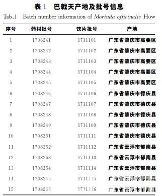 ShimadzuCorporationLC-20AT 高 效 液 相 色 譜儀,SartouiusCPA225D 分 析 天 平,水 循 環(huán) 真 空 泵,SENCOTechnologyCo.Ltd.提供;JM-A5002電 子天平,浙江余姚市紀銘稱重校驗設備有限公司提 供;DHG-9140A 干燥箱,上海精宏儀器設備有限公司提供;KQ-500DE超聲波清洗器,江蘇昆山舒美超聲儀器有限公司提供。 耐斯糖對照 品,批 號 為111891-201403;水 晶 蘭 苷 對 照 品,批 號 為 111870-201303;乙 腈,批 號 為 20161014;甲醇,色譜純,批號為20161020;水,純化 水;磷酸,分析純。 巴戟天藥材共計15批,經(jīng)河北省藥品檢驗研究院孫寶惠老師鑒定為正品,樣品來源信息見表1。