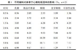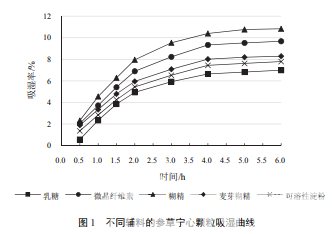 選取制粒常用輔料乳糖、可溶性淀粉、微晶纖維 素、麥芽糊精、糊精,分別與浸膏粉按 1∶1 比例混 勻,干法制粒(送料速度 30 r/min、滾輪轉(zhuǎn)速 4 r/min、 滾輪壓力 60 MPa),并按“2.2.1”項(xiàng)下方法測(cè)定所制 顆粒的吸濕率,繪制吸濕曲線,結(jié)果見表 1、圖 1。