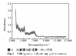 將樣品均勻裝入樣品杯中,置于樣品臺上掃描。采樣方式為積分球漫反射, 每個(gè)樣品均重復(fù)2次裝樣掃描,平均得到一條近紅外光譜,以消除樣品不均勻性帶來的干擾。光譜采集條 件為:光譜掃描范圍4000~12000cm-1,分辨率16cm-1,掃描次數(shù)64次,采樣點(diǎn)數(shù)1154。大米樣本的 近紅外光譜如圖1所示。
