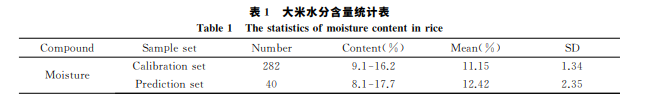 采用 Kennard-Stone法將樣本集劃分為校正集和預(yù)測集,其中校正集282個(gè)樣本,預(yù)測集40個(gè)樣 本。322份樣本的水分含量的常規(guī)分析結(jié)果如表1所示,校正集樣品大米含水量的變化范圍在9.1%~ 16.2%之間,預(yù)測集樣品含水量在8.1%~17.7%之間,校正集是預(yù)測集的子集,能更好的驗(yàn)證所建立的 模型對變化數(shù)據(jù)的適應(yīng)性。本實(shí)驗(yàn)選取的大米樣品水分含量范圍分布較廣,基本上覆蓋了大米中可能出現(xiàn)的水分含量。