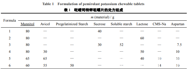 本品設計規格為 5 mg,處方以吡嘧司特鉀為主藥,甘露醇為稀釋劑和矯味劑,預膠化淀粉、 微晶纖維素為稀釋劑,羧甲基淀粉鈉為崩解劑,阿司巴坦和桔子香精為矯味劑;硬脂酸鎂為潤滑 劑;體積分數 70%乙醇為潤濕劑,通過對制粒情況和咀嚼片外觀性狀、口味、脆碎度以及崩解度 項目的綜合考察,篩選最佳處方。各處方中吡嘧司特鉀均為 5 mg、香精為 3 mg、硬脂酸鎂 3 mg, 體積分數 70%乙醇適量,其他材料用量見表 1。通過對不同處方工藝的制粒狀況和制成的咀嚼片 的外觀性狀、口味、脆碎度以及崩解度考察,處方 6 的各項常規檢查指標較好,由此確立為本品 的制備處方。