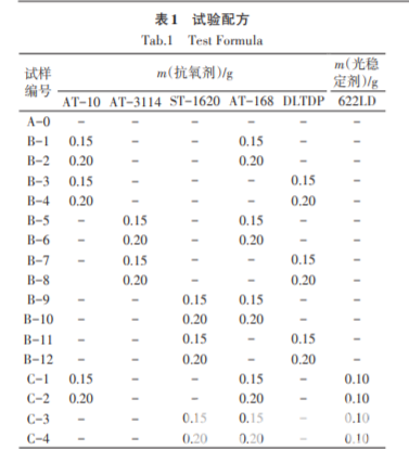 C5 石油樹脂(軟化點為 100~102 ℃,Gardner 色 號為 6#,熔融黏度為 225~240 mPa · s,溴值為 58~ 63 cgBr·g-1),工業級(牌號 YH-1288),寧波甬華樹 脂有限公司;抗氧劑AT-10、AT-168、AT-3114,工業 級,寧波金海雅寶化工有限公司;抗氧劑 ST-1620,工業級,上海石化西尼爾化工科技有限公司;抗氧 劑1076、抗氧劑DLTDP,工業級,天津力生化工有限 公司;光穩定劑Tinuvin 622LD,工業級,巴斯夫。