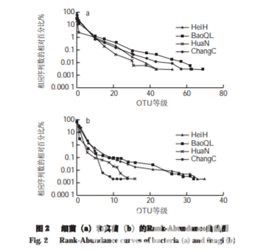 在Rank-Abundance曲線中,OTU等級代表系統群落 物種的豐度,OTU等級越高,表示系統里物種越豐富。 OTU曲線越平滑,表示系統里物種越均勻。由圖2a可 知,BaoQL的細菌物種豐度最高,物種數量分布也最均 勻,ChangC的次之;由圖2b可知,HeiH的真菌物種豐度 最高,BaoQL次之;真菌物種數量分布上,BaoQL更加 均勻,這可能與兩個地區的緯度差異和氣候不同有關。
