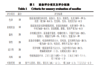 參照SB/T 10139—1993《饅頭用小麥粉》主要評(píng)價(jià) 指標(biāo)對(duì)面條的顏色、表觀狀態(tài)、咀嚼性、彈性等7 個(gè)評(píng)分項(xiàng)目進(jìn)行評(píng)價(jià),滿分為100 分。挑選10 個(gè)愛吃面條且具 有一定專業(yè)知識(shí)的人員組成感官評(píng)定小組,對(duì)添加不同比 例的LOX面條進(jìn)行感官評(píng)定,最后將小組評(píng)定結(jié)果的平均 分作為最終得分。面條評(píng)分項(xiàng)目及評(píng)分標(biāo)準(zhǔn)如表1所示。