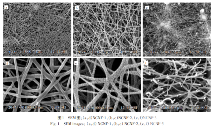圖1為NCNFs的SEM圖。由圖1(a)和圖1(b) 可以看出,纖維的表面光滑,纖維的直徑大小比較 均一,平均直徑為 160 nm,纖維未出現(xiàn)珠結(jié)狀結(jié)構(gòu),說(shuō)明質(zhì)量分?jǐn)?shù)8%的PAN紡絲溶液可紡程度較 高。圖1(c)和圖1(d)是PAN/PVP(PAN和PVP的質(zhì)量比為2∶1)基NCNFs,纖維的平均直徑為150 nm, 與只加入PAN的溶液相比,纖維變得粗糙,表面出 現(xiàn)大量的裂紋和孔隙,主要是由于PVP 在高溫下 分解產(chǎn)生大量的CO2和CO等氣體,使得纖維上產(chǎn) 生裂紋和孔隙。圖1(c)和圖1(d)中還可以看到少 量斷裂的纖維,說(shuō)明產(chǎn)生的裂紋和孔隙還影響 了纖維的脆性,使得纖維變得容易斷裂。圖1(e) 和圖1(f)是KOH活化處理后的NCNFs,纖維變得 彎曲緊密和粗糙,并且大量的斷裂,很難維持纖維 原有的形貌。主要是由于KOH的處理過(guò)程中與碳 纖維發(fā)生氧化還原反應(yīng),拓展了因加入 PVP 后 NCNFs 形成的孔洞,少量的 K 單質(zhì)插入碳層中使 得碳層膨脹,導(dǎo)致NCNFs 的纖維出現(xiàn)大量斷裂的現(xiàn)象。