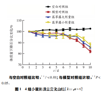 將 24 只 C57BL /6J 小鼠采用體質(zhì)量 分層隨機數(shù)字表法分為空白對照組,模型對照組,茜草 藤大、小劑量組,每組 6 只。