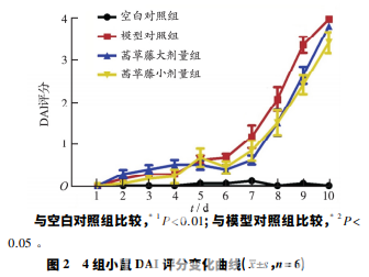 茜草藤大、小劑量組分別 預防性灌胃茜草藤提取物 4.8,1.2 g·kg-1 ,預防性給 予 3 d,空白對照組和模型對照組灌胃等體積純化水; 模型對照組和茜草藤大、小劑量組分別給予 3% DSS 溶液造模,自由飲用,連續(xù)飲用 7 d,空白對照組小鼠 給予純化水飲用,直到實驗第 10 天。小鼠灌胃藥物, 給藥體積為 20 mL·kg-1 ,每天 1 次,空白對照組小鼠 給予純化水。
