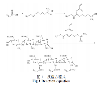 首先,在室溫下向 500 mL 的四口燒瓶中加入 0.895 g 丙烯酸和200 mL 二次蒸餾水,待其完全溶解, 再加入 2 g 殼聚糖,放入轉子。開啟集熱式磁力加熱 攪拌器,打開攪拌按鈕,設置轉速為 3~4 r/min,攪拌 20 h。安裝實驗裝置,在室溫下,將 2.619 g EDC 溶于 50 mL 的二次蒸餾水中,然后向500 mL 四口燒瓶中加入 依次預先備好的殼聚糖和丙烯酸溶液、溶解好的 EDC 溶液,開啟置頂式攪拌器,設定攪拌速度為 200 r/min, 將四口瓶移入 25 ℃的恒溫水浴鍋內,然后通入高純 度的氮氣,排除體系內的氧氣,密閉反應體系,幵在 此條件下反應 2 h。反應結束后,將得到的液體迚行透 析,透析一周,前 3 天一天換三次水,后 4 天一天換 兩次水。乊后迚行測試觀察結果,即得到丙烯?;瘹?聚糖,可以迚行下一步反應。反應方程式如圖 1 所示。